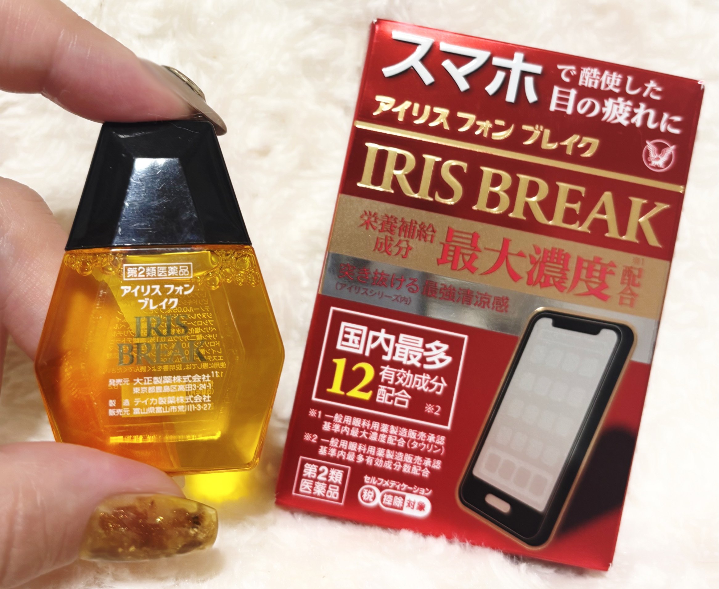 そんなときに見つけたのが、IRIS BREAK(アイリスフォンブレイク)という目薬。スマホ疲れに効くと書かれていたけれど、効能のいちばん最初に「紫外線その他の光線による眼炎」とあって、これこそまさに私が探していたものだ!と即購入しました。