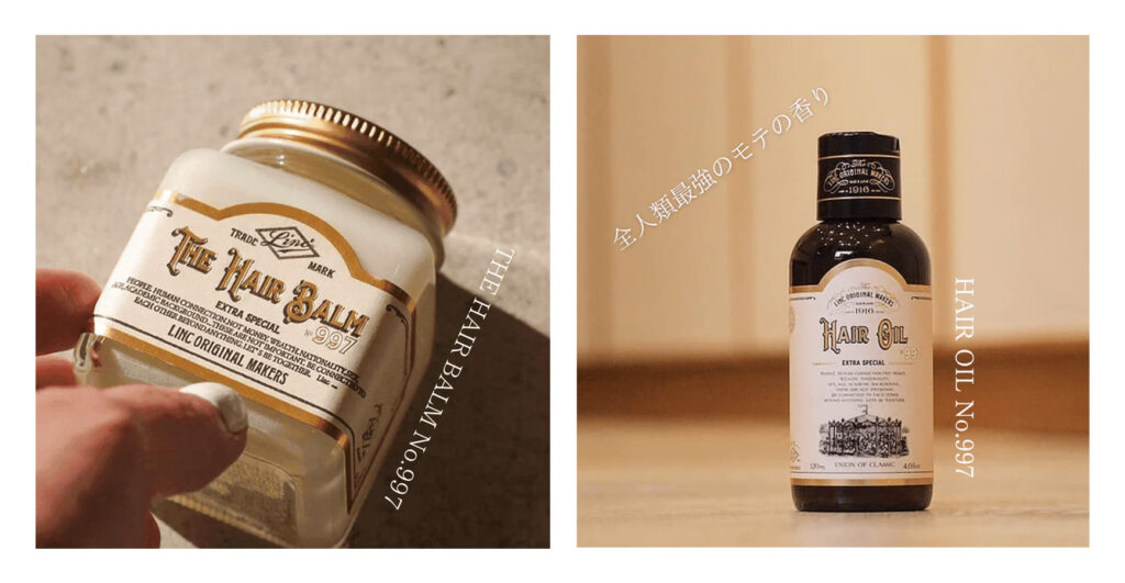 LINC ORIGINAL MAKERS / リンク オリジナル メーカーズ の THE HAIR BALM 997 (ヘアバーム・画像左)と HAIR OIL 997(ヘアオイル・画像右)